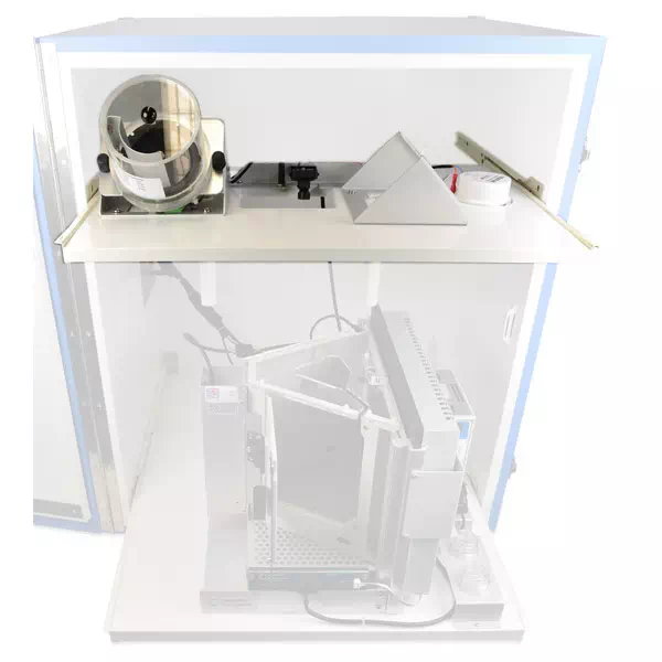 Rolling Top Shelf Assembly for includes speaker, LED house light and dual position fittings for pellet dispenser enabling Autoshaping Task. Rolling top shelf enables installation of commutators/rotameters without the need to fix to the sound attenuating chamber ceiling possibly compromising the isolation. Pulls out with the chamber to allow easy access, while keeping the tether at the optimum length.