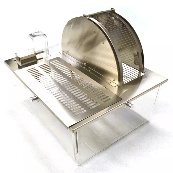 This Scurry voluntary running wheel with living chamber was designed for long term circadian rhythm and general activity studies in rats or similar sized animals.