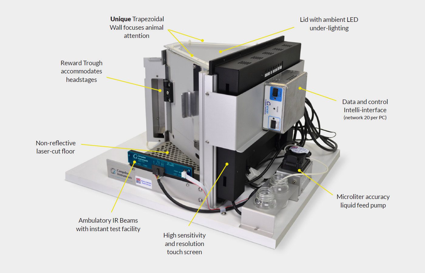 - Reward trough supports pellet retrieval and dual liquid feeds, with a wider aperture for head-staged animals.