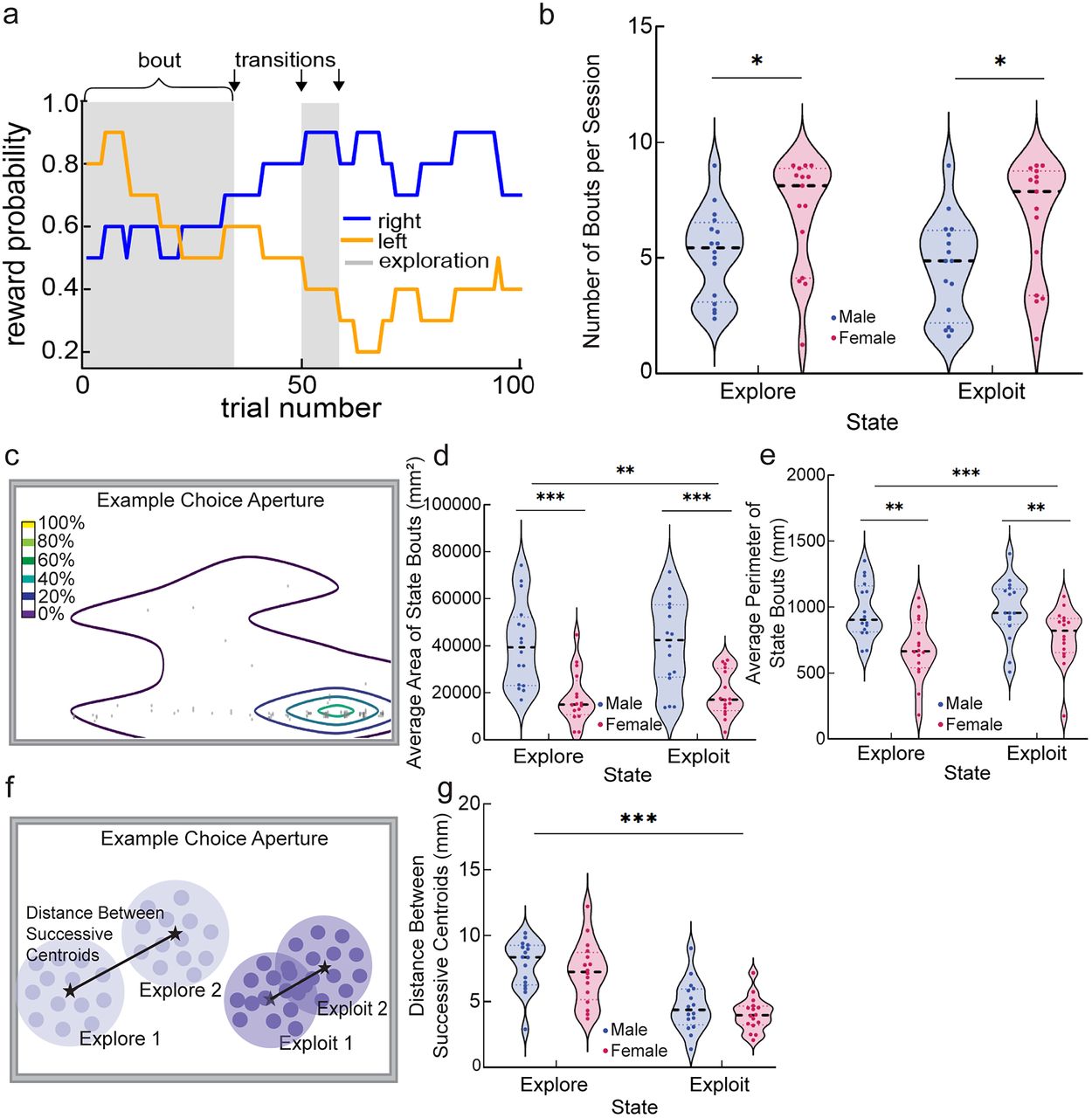 Together, these results by Mueller et al. (2025) demonstrate that internal decision states, reward history, and sex shape the spatial and temporal structure of actions, with exploitation reflecting a transition toward efficient, stereotyped behavior. More broadly, this work highlights how fine-scale behavioral measurements can reveal the underlying organization of adaptive decision-making in dynamic environments.